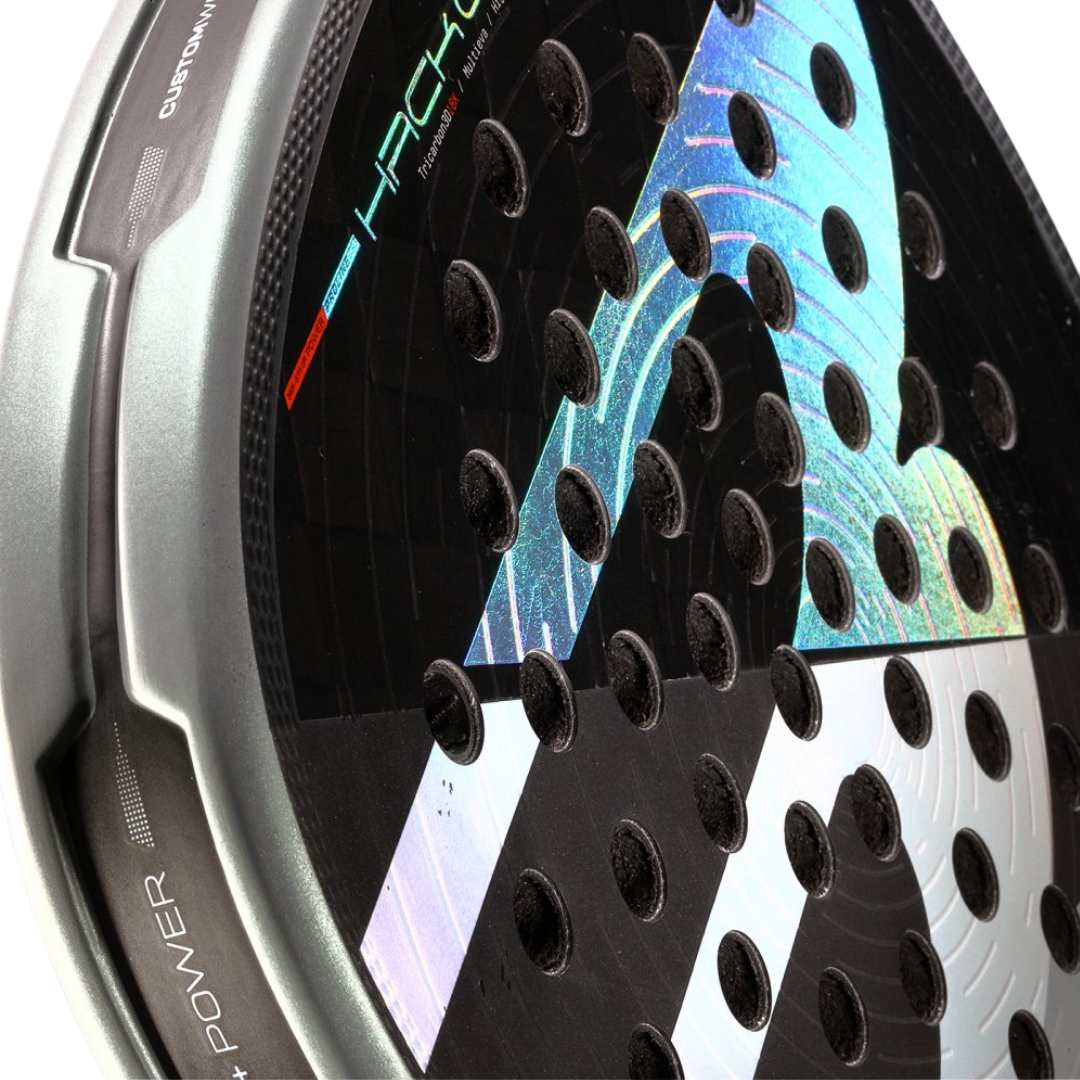 TRICARBON 18K: Fibra de carbono tridireccional (18.000 filamentos) que combina ligereza, elasticidad y rigidez para golpes veloces y potentes.