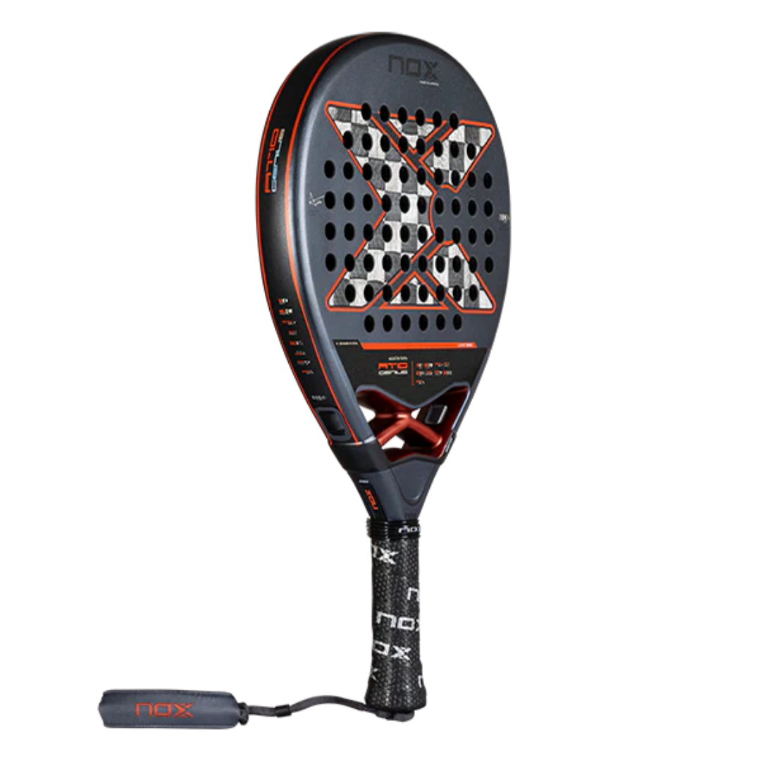 La pala de Agustín Tapia para la temporada 2025. Una pala fabricada mano a mano junto al Mozart de Catamarca con cara de fibra de carbono aluminizada y un doble acabado rugoso (3D hexagonal en el centro y textura de arena en el resto) mejora el control y permite añadir más efecto a la bola. Esta versión formato lágrima integra en su interior se ha optado por un núcleo multicapa que conjuga distintas densidades de goma para optimizar la salida de bola en golpeos defensivos de baja velocidad y la potencia en remates. También incorpora la tecnología Nox Custom Grip y Pulse Sytem que mejoran la absorción de las vibraciones que llegan a la mano, reduciendo la fatiga articular.