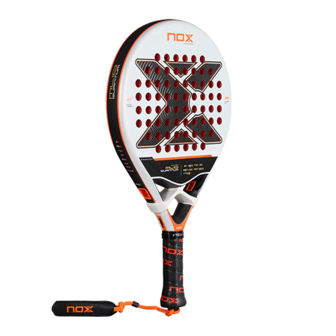 Pala NOX ML10 Quantum 3K 2025 la pala de Miguel Lamperti para la temporada 2025. Una pala fabricada en fibra de carbono 3K y goma HR3, una goma de alta densidad con gran salida de bola. Sus caras incluyen la tecnología EXCLUSIVE SPIN, con doble acabado rugoso: 3D hexagonal en el centro y textura de arena.
