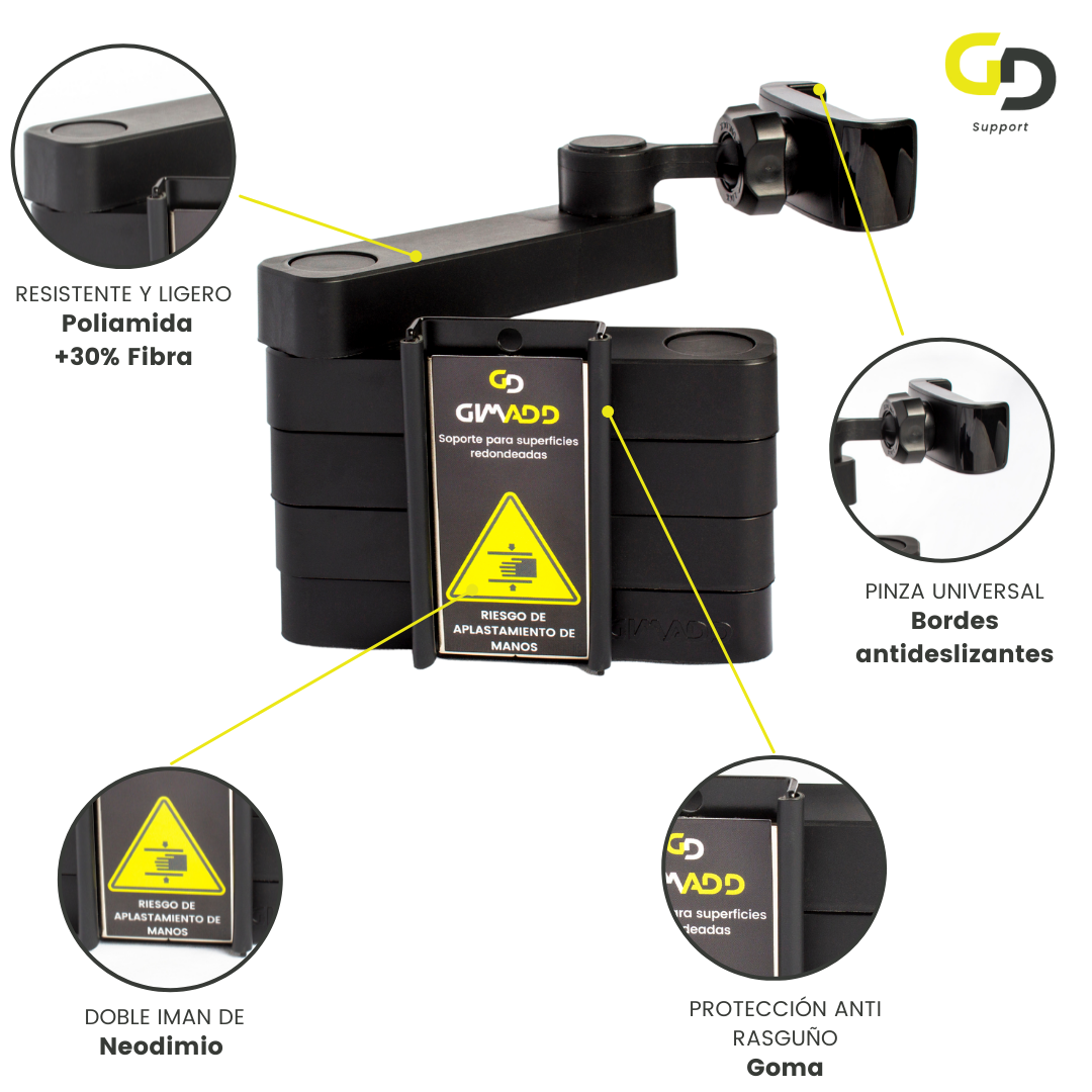 - Material Premium: El Gimadd Support está fabricado con una poliamida reforzada con fibra al 30%, proporcionando una estructura robusta y al mismo tiempo ligera, ideal para el transporte y uso continuo en diferentes entornos deportivos.